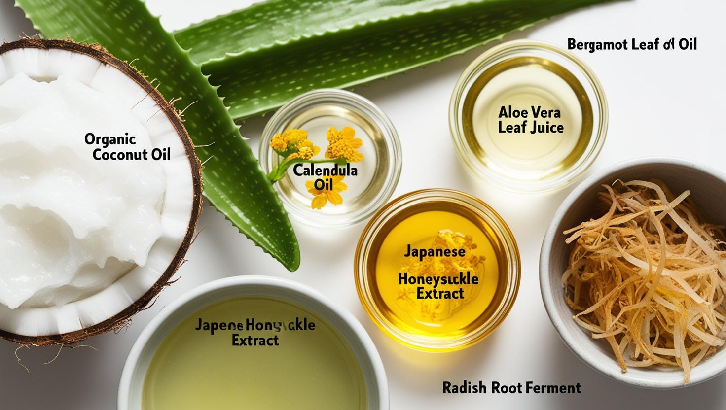 Aqua (Distilled Water), Coco Glucoside, Glycerin (Vegetable), Organic Cocos Nucifera (Coconut) Oil, Leuconostoc (Radish Root) Ferment Filtrate, Xanthan Gum, Lonicera Japonica (Japanese Honeysuckle), Citric Acid, Calendula Officinalis (Calendula) Oil, Organic Aloe Barbadensis (Aloe Vera) Leaf Juice, Citrus Bergamia (Bergamot) Leaf Oil